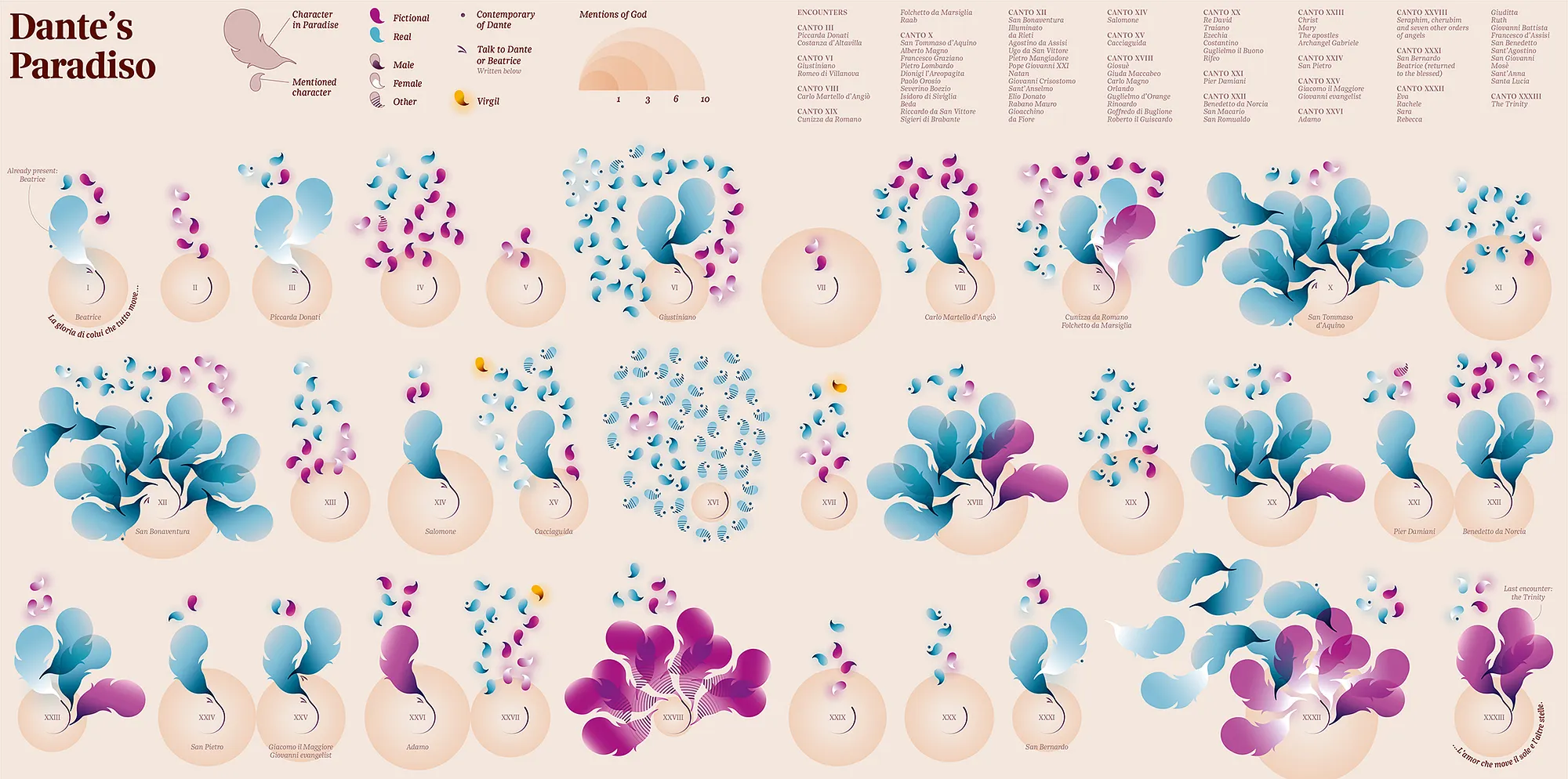 Michela Lazzaroni, information designer freelance, si è cimentata in un’analisi del testo piuttosto ambiziosa: la Divina Commedia di Dante Alighieri. Lazzaroni rappresenta visivamente il viaggio di Dante concentrandosi sui personaggi incontrati dal Poeta, o anche solo nominati. Il risultato sono 3 tavole (una per ogni cantica) che riassumono per ogni canto quanti personaggi Dante incontra, quanti ne nomina, il genere di appartenenza di ciascuno e se risultano realmente esistiti o meno.