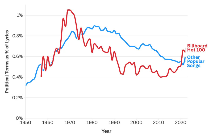 Per rispondere alla domanda l’autore ha sviluppato un indicatore chiamato “political density” che contava il numero di parole “politiche”, quali ad esempio: “giustizia”, “rivoluzione", “uguaglianza”, presenti nei testi delle canzoni esaminate. Il risultato di questa analisi mostrava un picco dei testi politici nei tardi anni ‘70 e poi un continuo declino fino agli anni 2010 in cui c’è stata una modesta ripresa, mantenendosi tuttavia molto lontani dai massimi storici.
